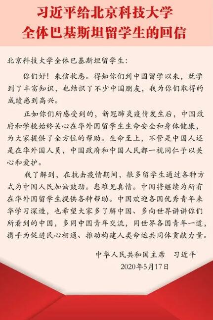 2020年5月17日,国家主席习近平给北京科技大学全体巴基斯坦留学生回信,对各国优秀青年来华学习深造表示欢迎,鼓励他们多同中国青年交流,同世界各国青年一道,携手为促进民心相通、推动构建人类命运共同体贡献力量。