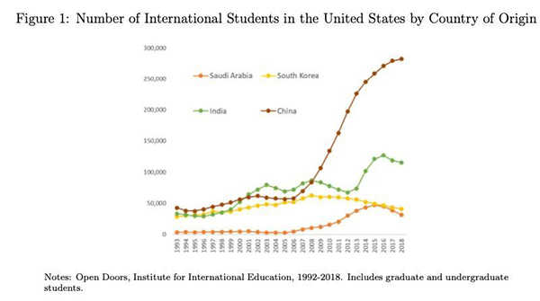 自2008年以来,中国学生赴美留学热潮给美国高等院校带来了巨大的经济收益。《2019美国门户开放报告》显示,在美国际生人数连续4年超过100万,中国是美国第一大生源国,留美人数占所有国际生的30%以上。不过,2018年中美贸易摩擦开始后,这一趋势明显放缓。