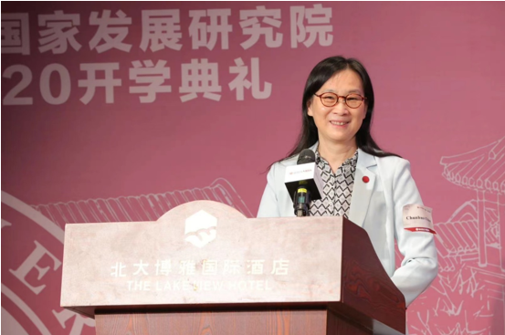 首先,北大国发院BiMBA商学院院长陈春花教授发表致辞。她表示,2020是个特别的年份,同学们能够最终来到BiMBA学习一定是克服了很多困难,付出了许多努力,而今天戴上北大校徽时,相信你们会感到一切都值得。她介绍说,国发院27年来始终坚持六位创始人最初的发心和使命,创造了成长的奇迹,同学们来到这里,可以为自己获取全新的生长可能性。优秀的人都是自我生长的,最关键的是首先要认识自我,这就需要认清自己和外界的关系,了解认识和现实的差距,并明白经验的局限性。每个人的潜力是巨大的,但最终能取得什么样的结果,取决于个人的习惯、态度、观念、愿望。认识自我并做出必要改变的过程中,知识起着重要的作用,陈老师把对自己人生影响最大的三本书推荐给同学们:《居里夫人》、《人生的盛宴》,和《卓有成效的管理者》。陈老师最后说,人生就是既有运气光临,也有逆境考验。就像战火纷飞的年代北大同学曾在西南联大里照常上课一样,今天我们的同学们在疫情期间仍然坚持在线学习,静心融入知识的熏陶。我们学会了接纳逆境,并能够与之相处,这样我们就能找到自己的方向,创造出真正的成长。