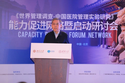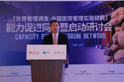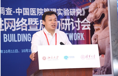 丁伟波总裁致辞四位嘉宾致辞结束后,北京大学中国卫生经济研究中心访问学者、北京中医药大学副研究员洪学智博士代表课题组,就世界管理调查方法论基本情况做了学术汇报。介绍了中国医院管理调查项目的基本情况、目前进展以及下一步将开展的工作,并代表项目组宣布《世界管理调查-中国医院管理实验研究》能力促进研讨网络启动。