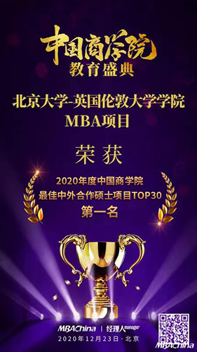 北京大学-英国伦敦大学学院MBA项目荣获“2020年度中国商学院最佳中外合作硕士项目TOP30”,并夺得第1名(与香港中文大学并列)。