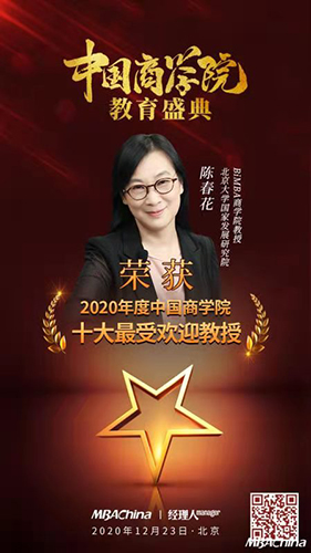北大国发院BiMBA商学院院长、北京大学王宽诚讲席教授陈春花荣获“中国商学院十大最受欢迎的教授”奖项。