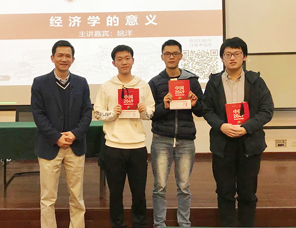 线上线下听众在互动环节踊跃提问,姚洋教授就经济学与其他学科交叉发展、以数据来源方式为例解释经济学如何做研究、经济学如何研究出普适性结论等问题深入作答,并向提问者赠送签名版新书《中国2049:走向世界经济强国》和精美书签。