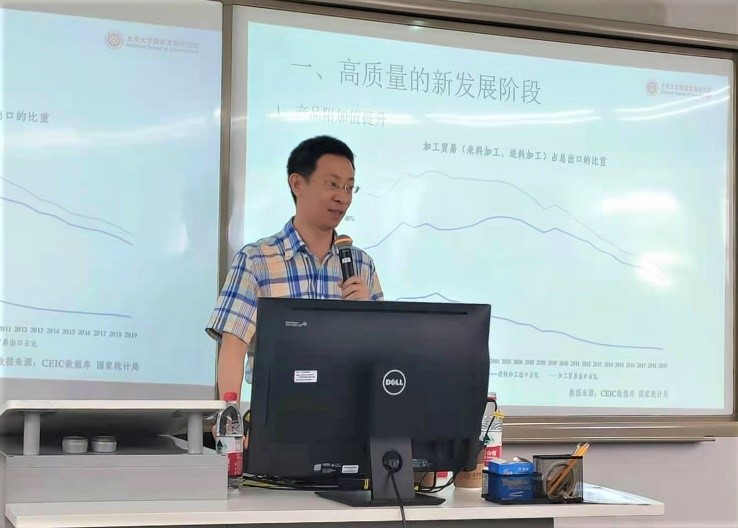 图为余淼杰教授剖析中国经济新发展阶段余淼杰教授分析,中国经济中加工贸易比重不断下降,间接反映产品附加值提升,叠加价格衡量下的产品质量改观,而这些微观结果主要得益于企业的生产效率和技术水平攀升,并通过各地主导产业达成规模经济,最终促使宏观结构中的三次产业占比调整。