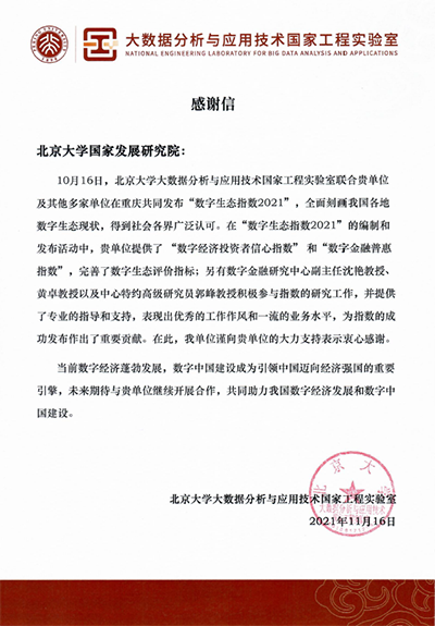 感谢信表示,在“数字生态指数2021-指数报告”编制和发布活动中,黄益平、沈艳两位教授分别提供了“数字普惠金融指数”和“数字经济投资者信心指数”两份研究成果,为报告完善了数字生态的评价指标。沈艳教授、黄卓副教授、郭峰研究员还积极参与指数研究工作,并提供专业指导和支持,过程中工作作风优秀、业务水平一流。