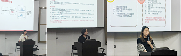 财务办公室张瑛主任、校派驻会计关欣老师、院出纳段岩老师依次详尽介绍了财务办公指南,内容包括日常业务报销、会议费报销、薪酬劳务、外汇业务以及基金会财务报销等规定和流程。