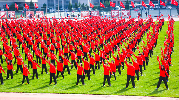 入场式结束,约20位北大国发院和南南学院老师参加全校大型团体操表演。
