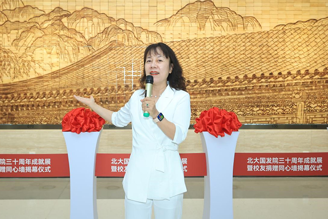 霍斌理事长代表学院校友基金致辞称,国发院三十载培育了大批优秀学子,大家也以多种方式回馈母校来表达这份深厚情感,包括集体铸就这面同心墙。建筑从不只是物质的累积,更重要的是精神和文化的传承,同心墙将见证大家的爱与奉献、团结与温暖。未来它会是美丽的校园风景,更会是新的活力源泉和激励师生校友前行的精神力量。母校也会继续致力于培养有国际视野、有创新精神和实践能力的高素质人才,期待大家积极参与学院活动,持续支持学院及校友基金,携手共创辉煌。