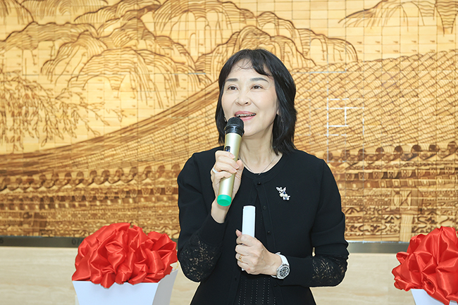 雷晓燕书记特别介绍“同心墙”及其寓意,学院为铭记师生校友们的奉献,巧妙设计了木质拼图,底图是朗润园和承泽园组合而成的线稿山水长卷,并命名“同心墙”。在承泽园校区,它是继“同心桥”之后第二处含“同心”寓意的学院建筑。同心桥连接古建群和教学楼,寓意连接传统和现代、中国和国际、研究和现实,同心墙则将是学院和贡献者、教师科研和校友实践、校友和在校生的纽带,既蕴含对学院历史与传统的集体追溯和认同,也将是学院光辉历史的重要组成部分。