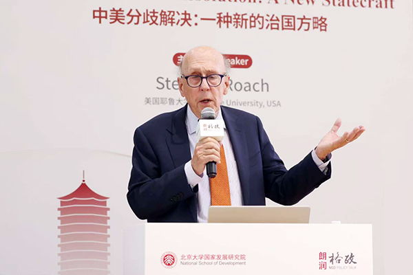 黄益平在致辞中对罗奇的到来表示热烈欢迎。他介绍,罗奇曾在摩根士丹利工作30年,长期担任亚洲区主席和首席经济学家,后来在2010年加入耶鲁大学。兼具华尔街思想领袖与学术研究的双重背景,使其成为宏观经济学分析领域的重要实践者。他表示,许多关注中美关系研究的学者对罗奇并不陌生,而国发院在经济研究中也始终重视中美关系的走向。他相信罗奇的此次演讲能为大家带来新的启发。