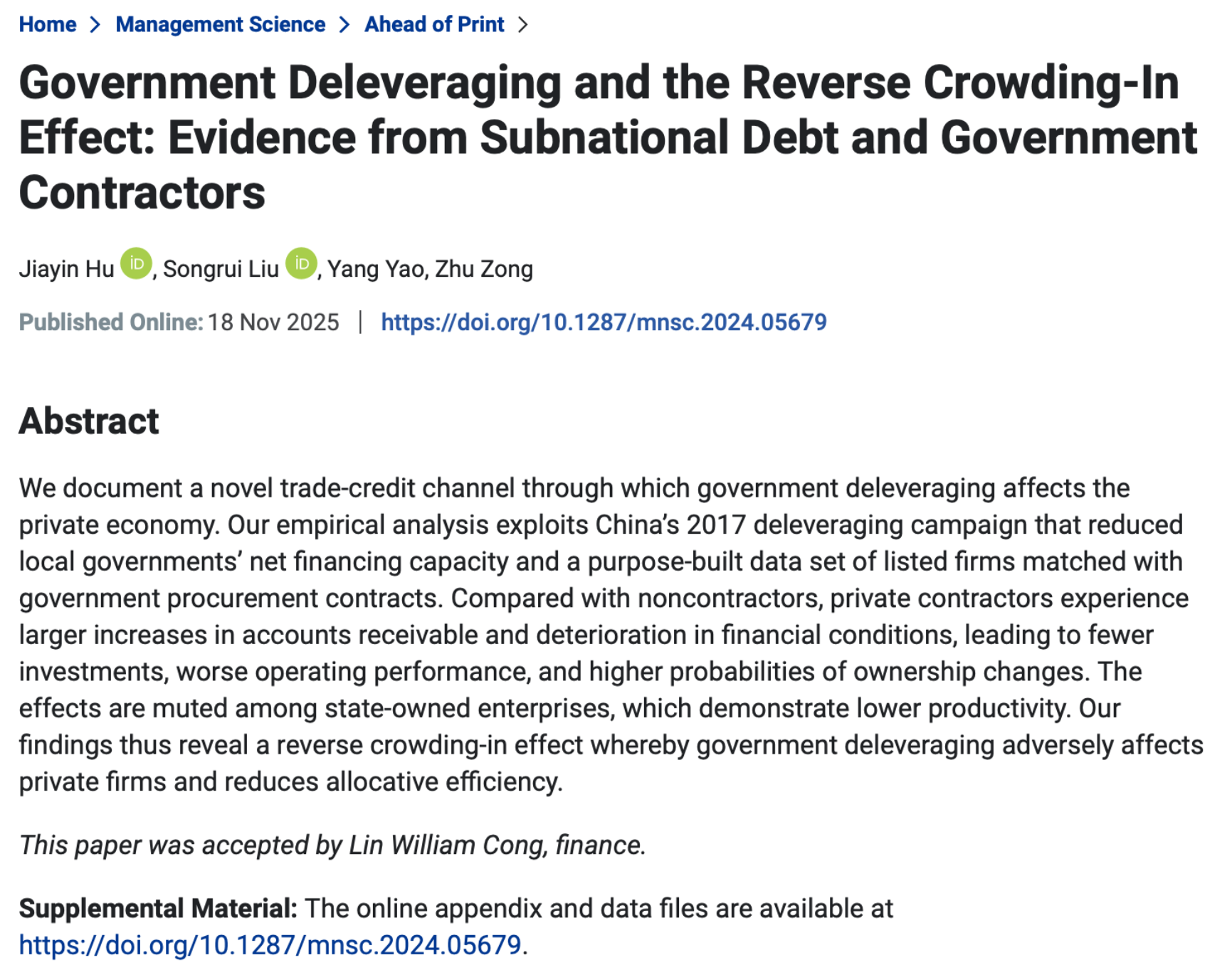 Hu, Jiayin, Songrui Liu, Yang Yao, and Zhu Zong. 2025. “Government Deleveraging and the Reverse Crowding-In Effect: Evidence from Subnational Debt and Government Contractors.” Management Science. //pubsonline.informs.org/doi/10.1287/mnsc.2024.05679