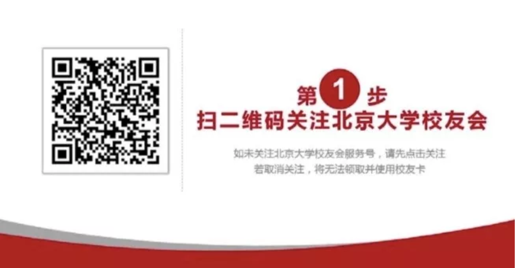 扫描识别二维码关注北京大学校友会,如未关注北京大学校友会服务号,请先点击关注,若取消关注,将无法领取并使用校友卡。